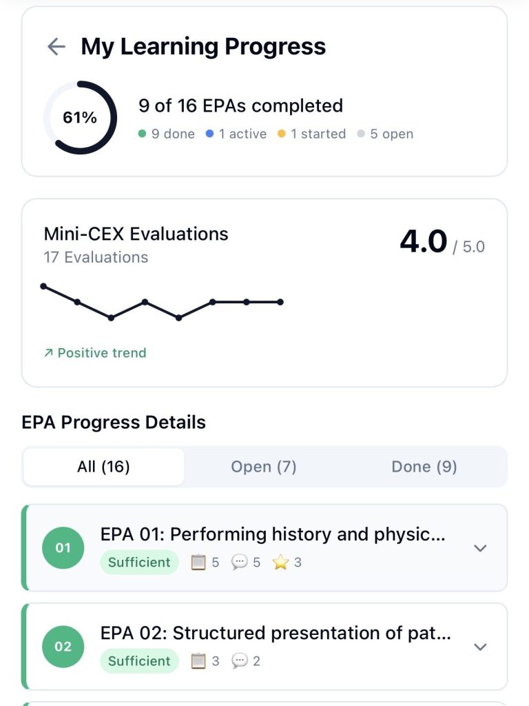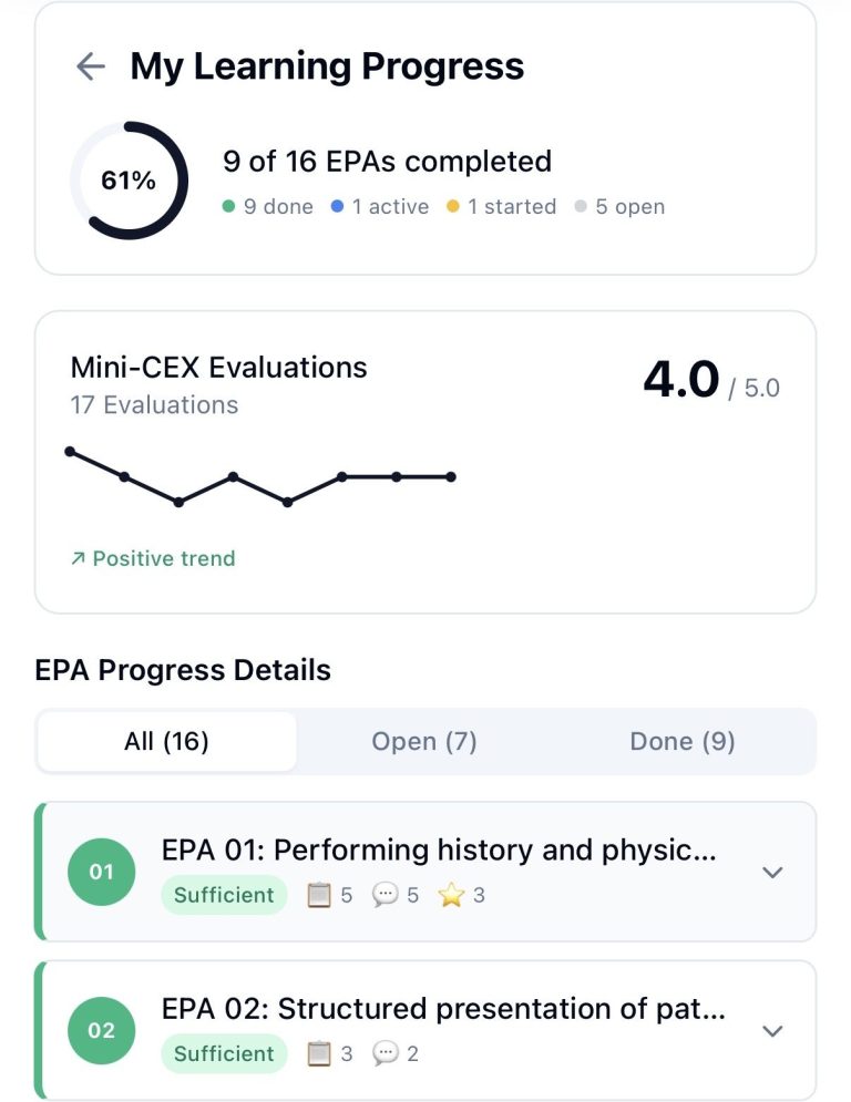 📈 Learning progress at a glance Students see in real time which EPAs they've completed and where development opportunities remain.