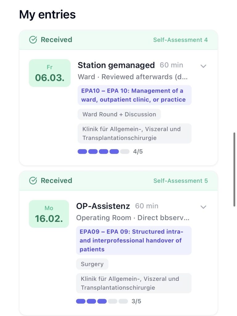 📋 Document activities & assign EPAs Every clinical activity is linked to the corresponding EPA. This creates structure and automatically fulfills NKLM requirements.