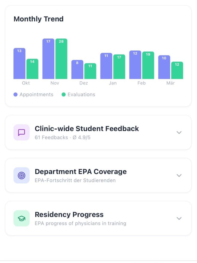 📊 Department-wide statistics Teaching coordinators see departmental capacity, EPA distribution, and feedback scores at a glance.